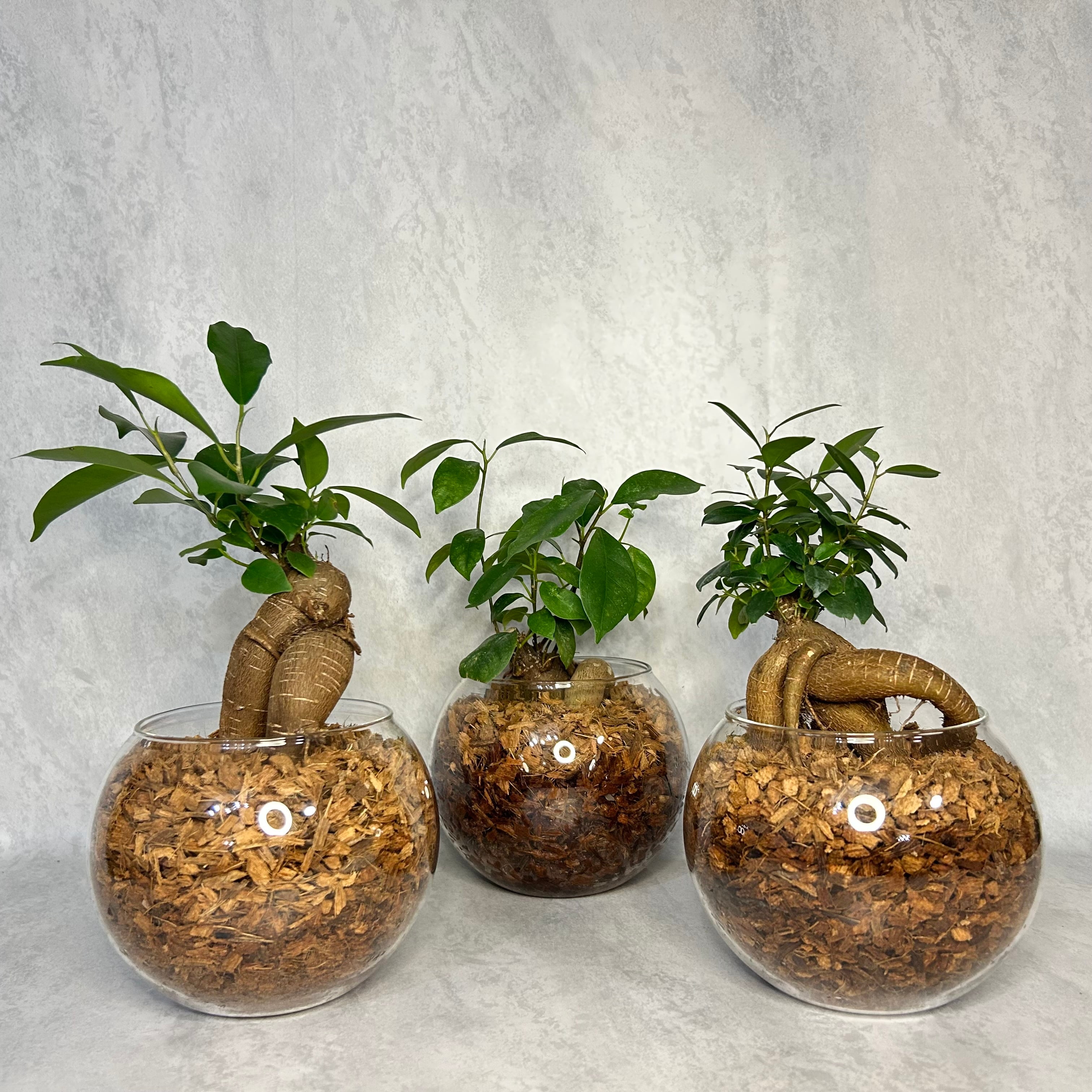 ガラス鉢に土の代わりにベラボン(ヤシの木チップ)で植えているので外から見て水やりのタイミングがわかりやすく管理が楽チン♫