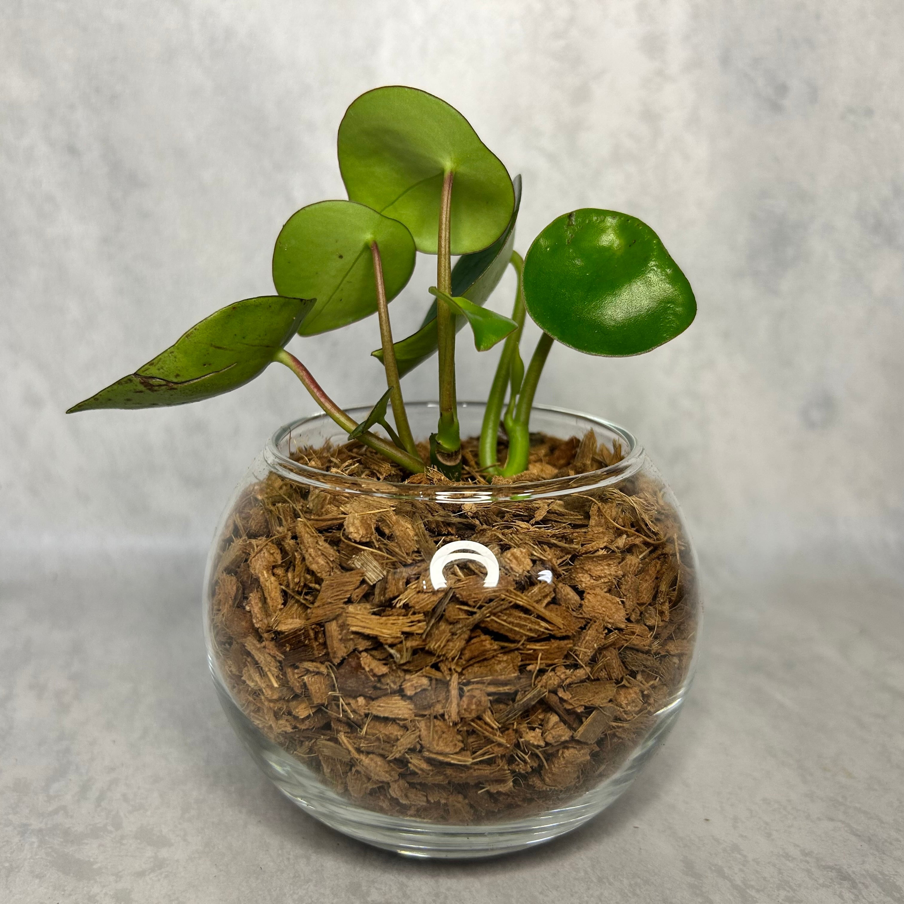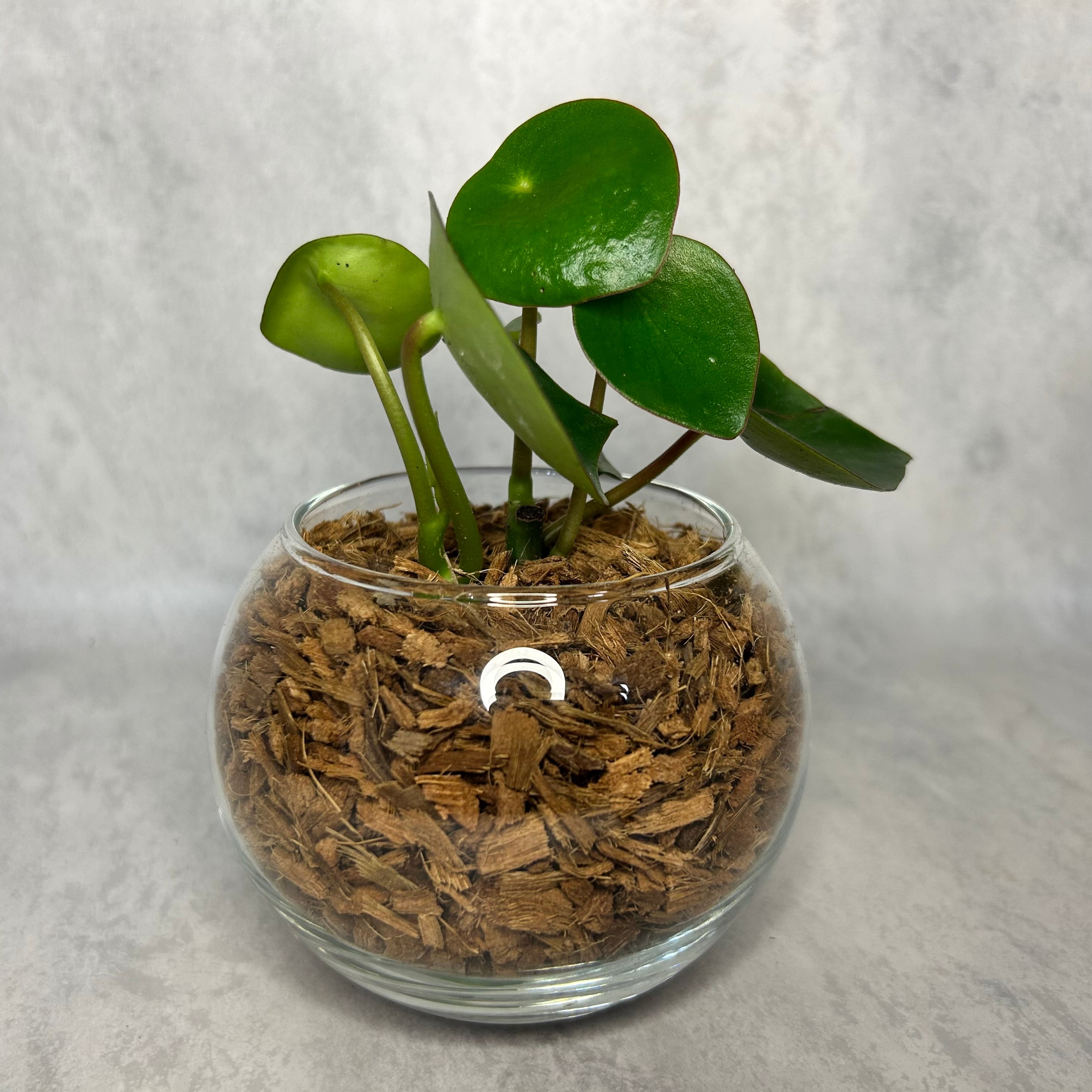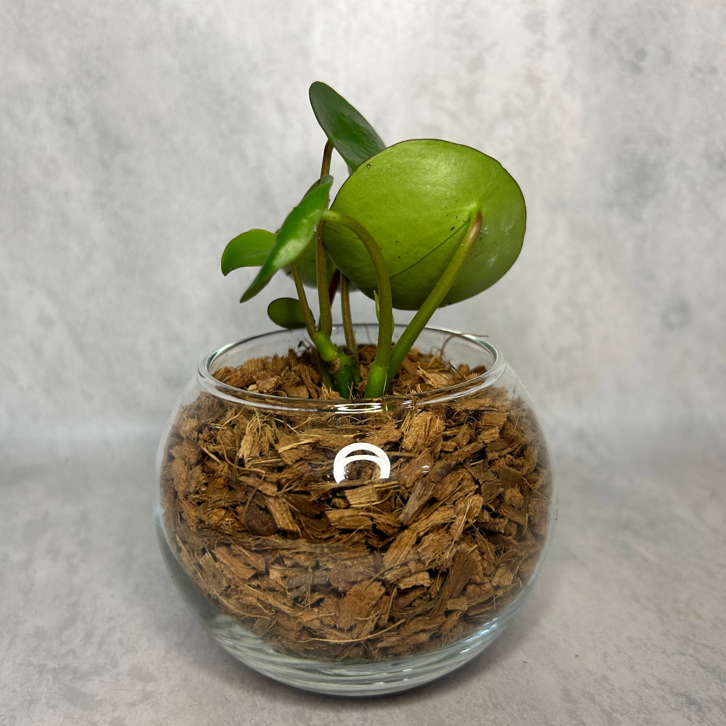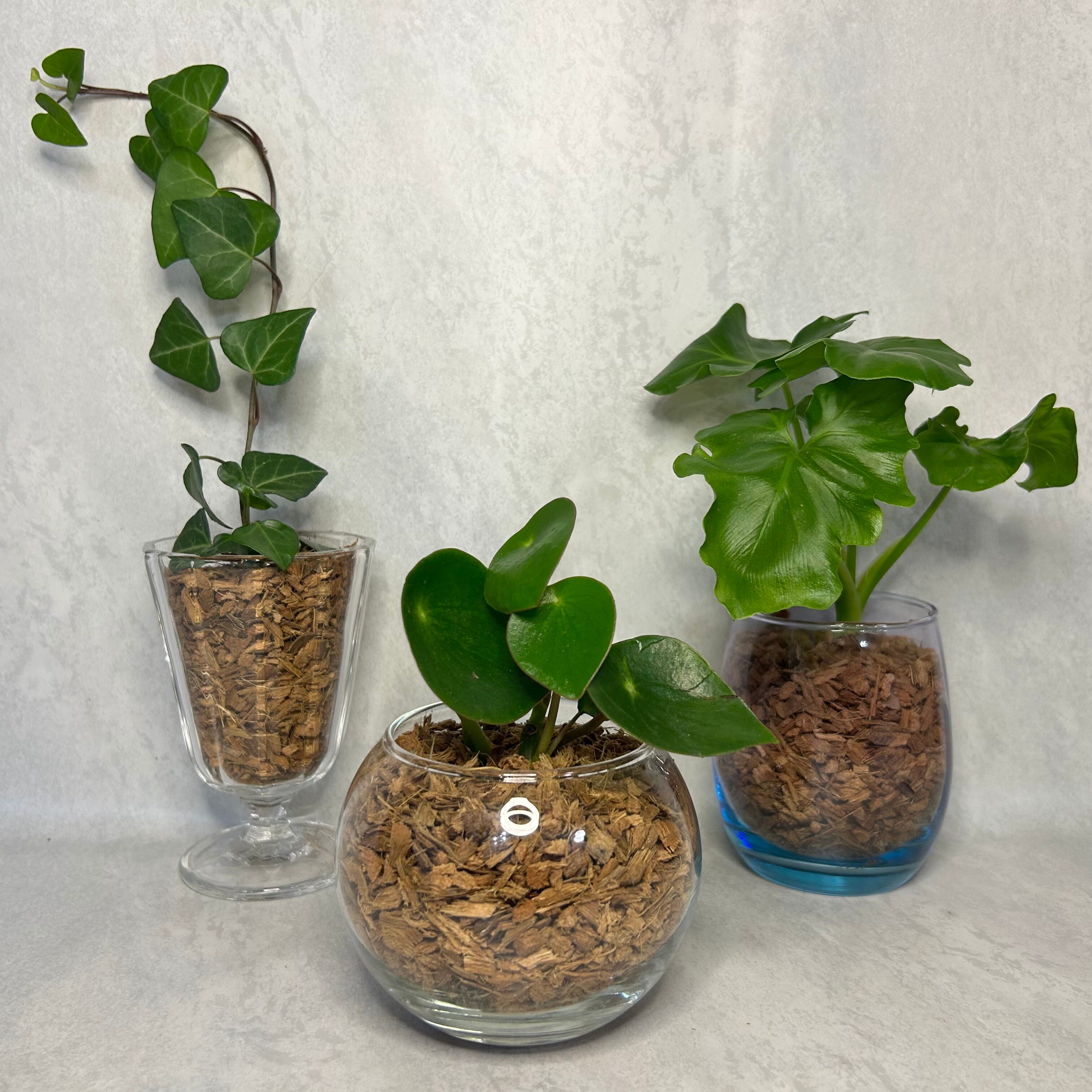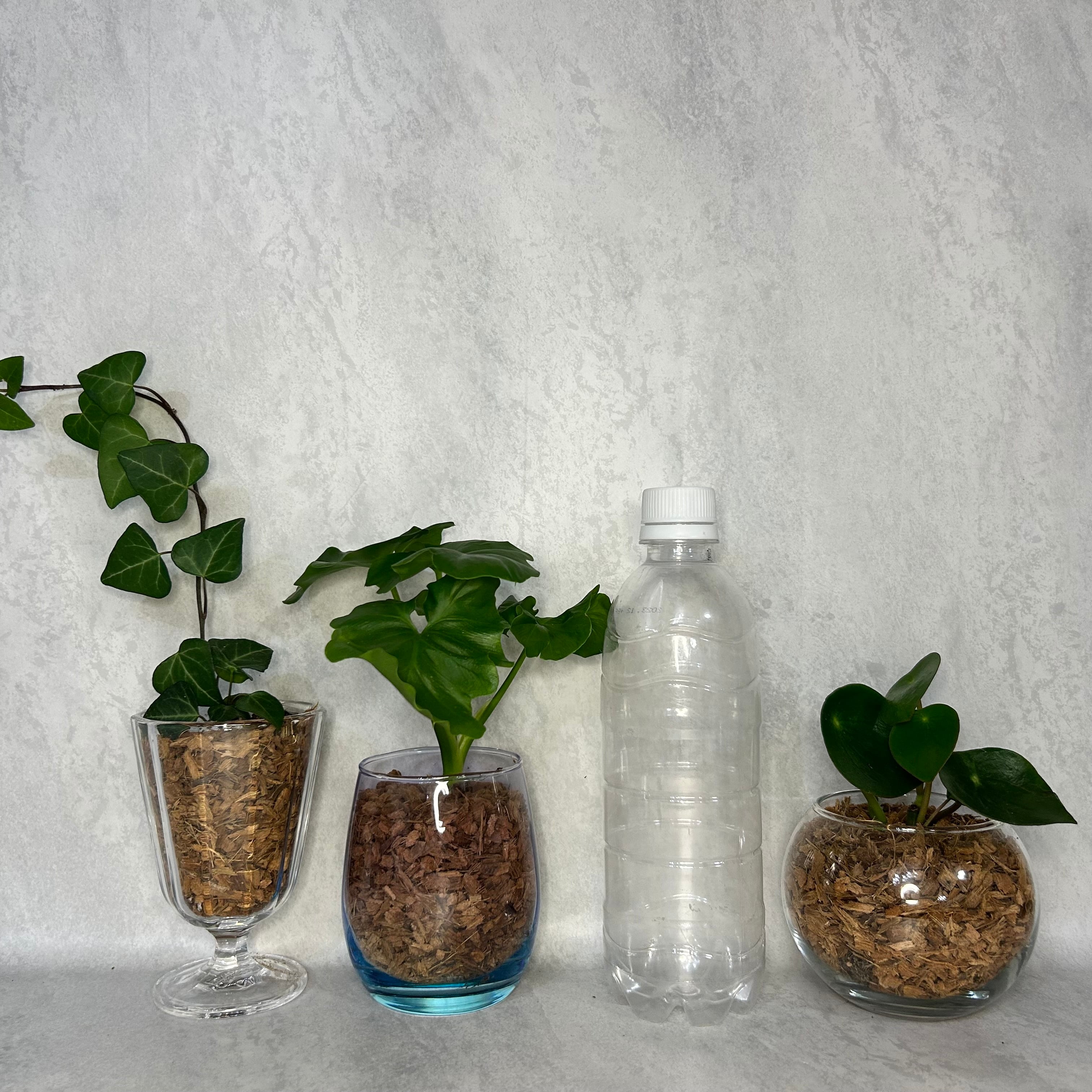 ガラス鉢に土の代わりにベラボン(ヤシの木チップ)で植えているので外から見て水やりのタイミングがわかりやすく管理が楽チン♫