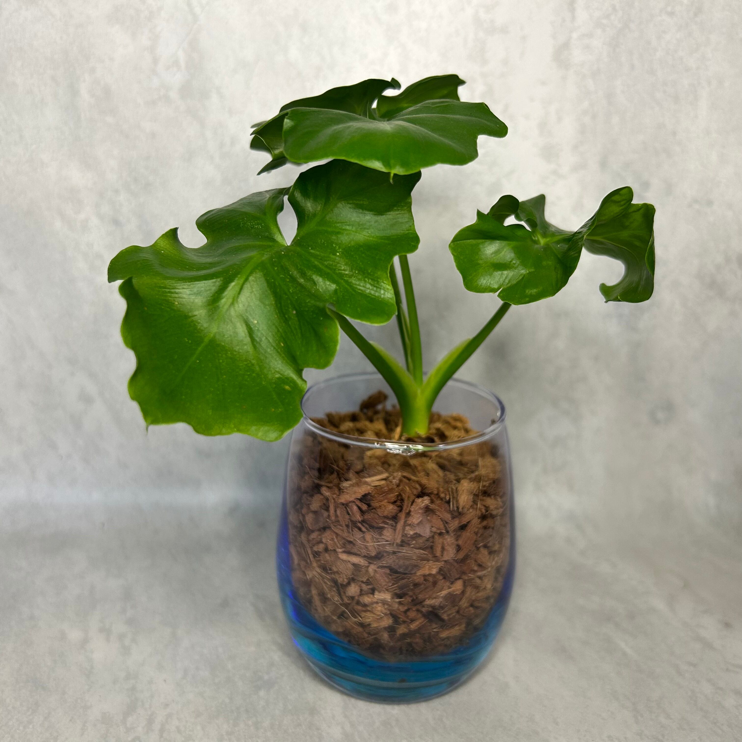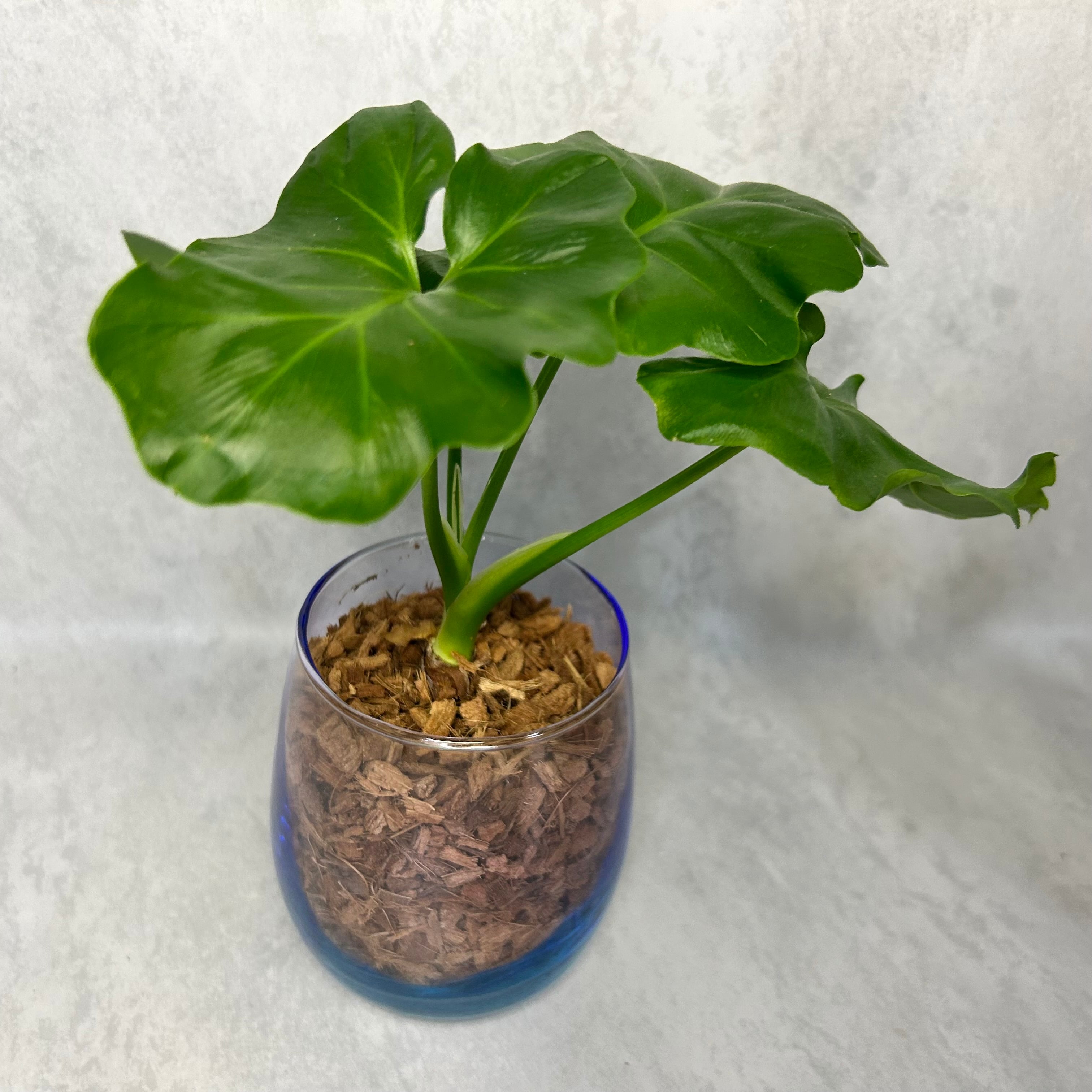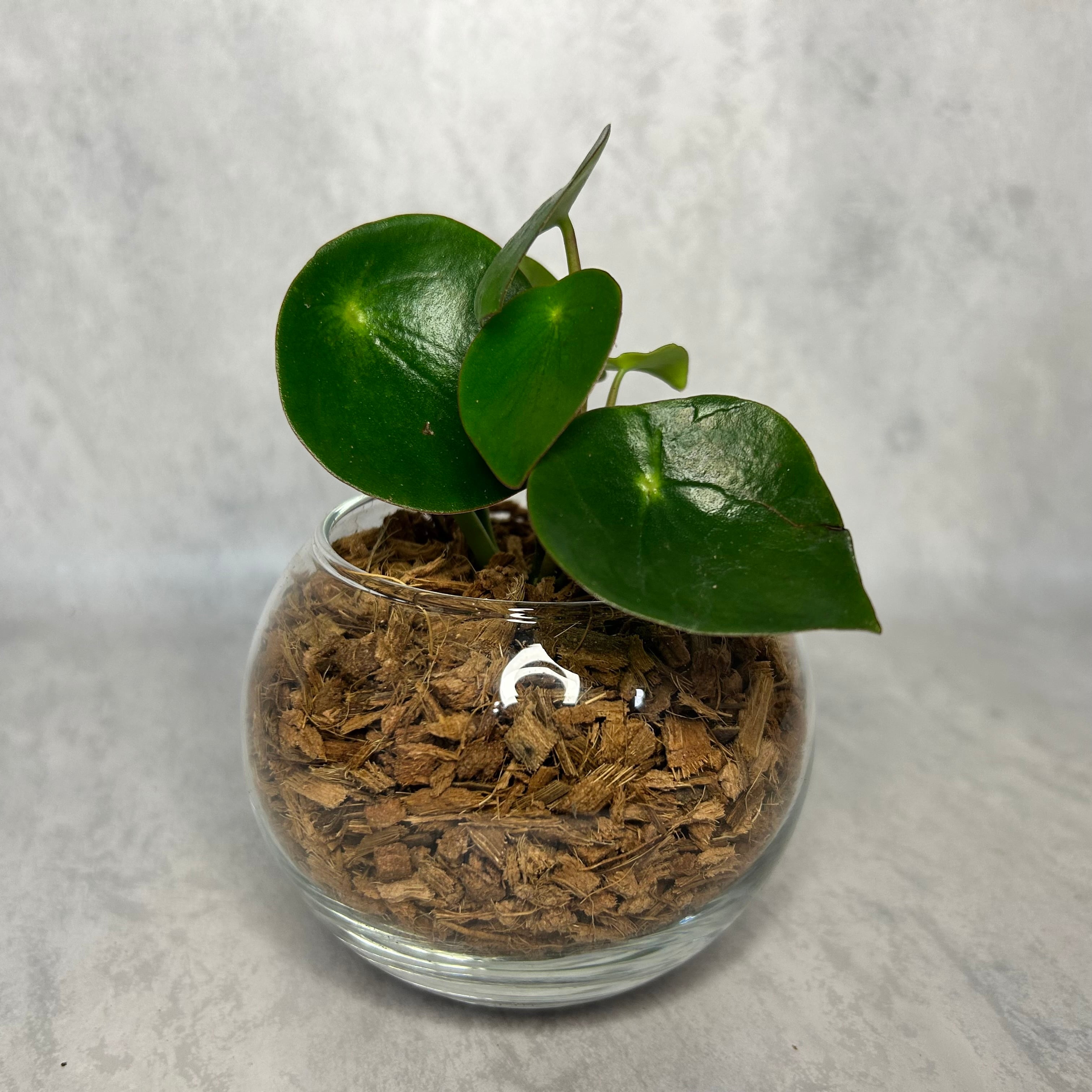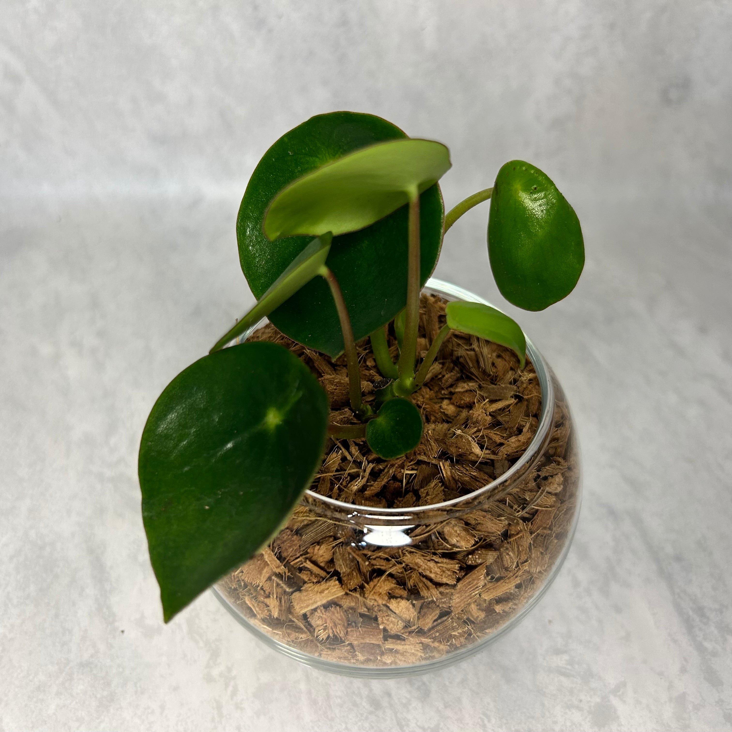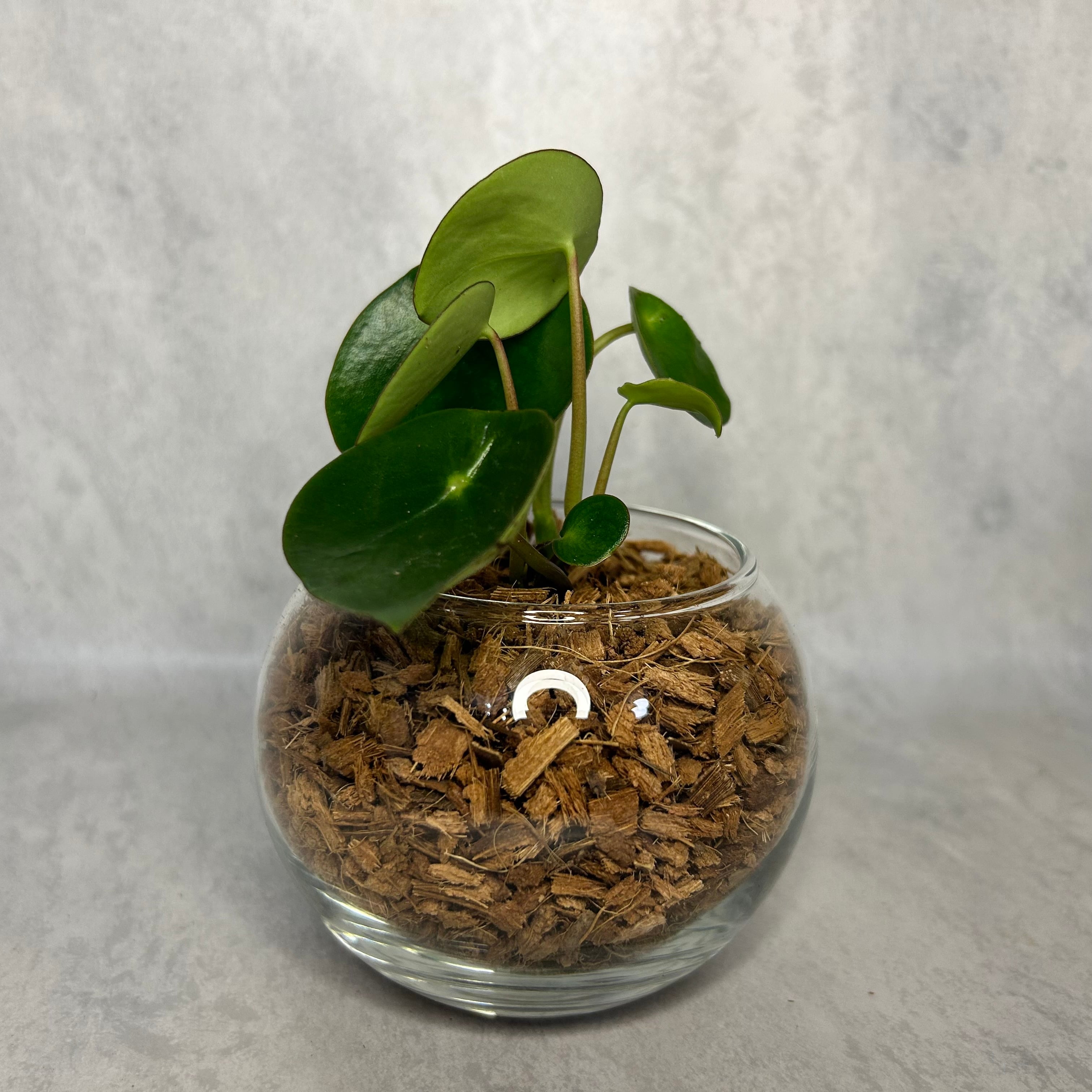 ガラス鉢に土の代わりにベラボン(ヤシの木チップ)で植えているので外から見て水やりのタイミングがわかりやすく管理が楽チン♫