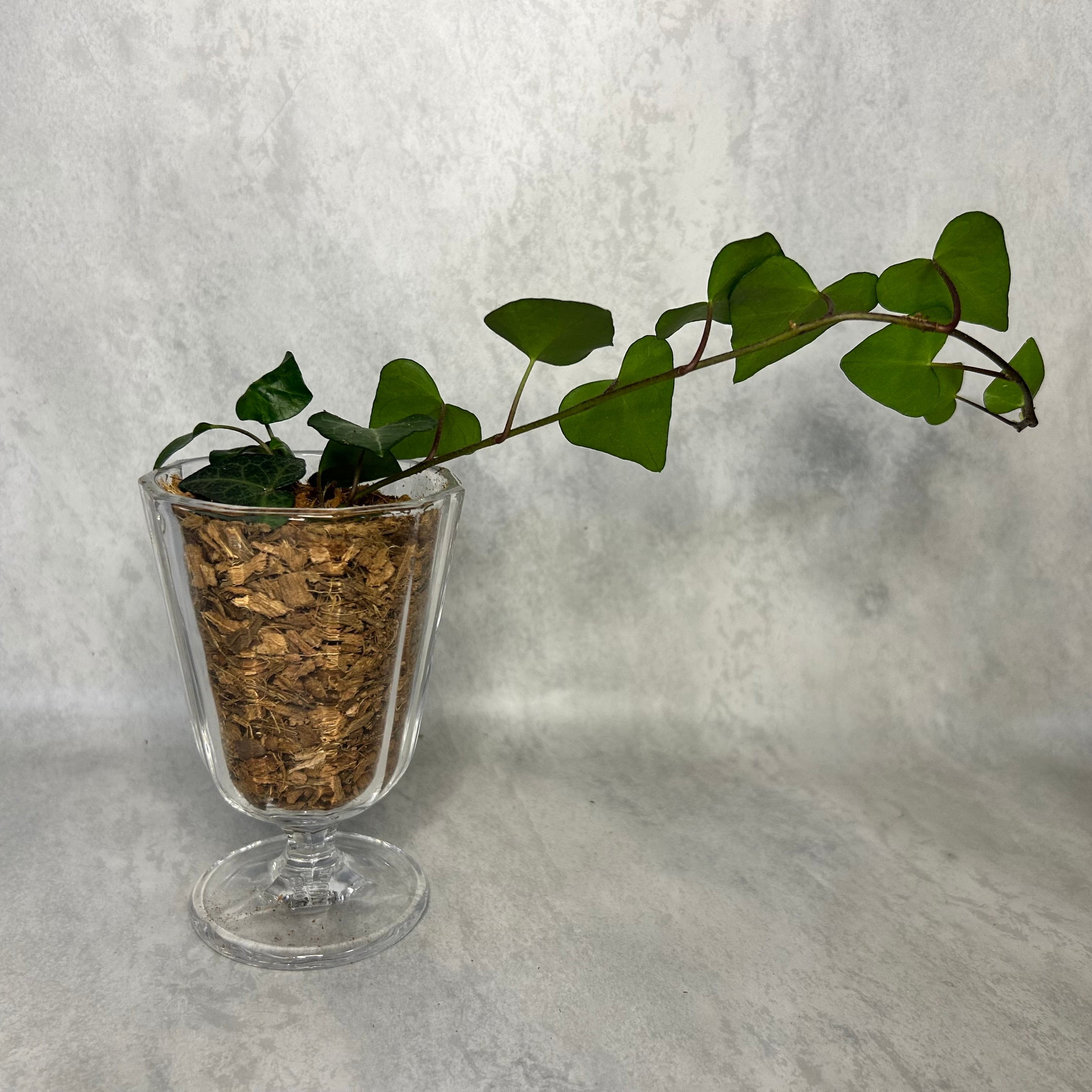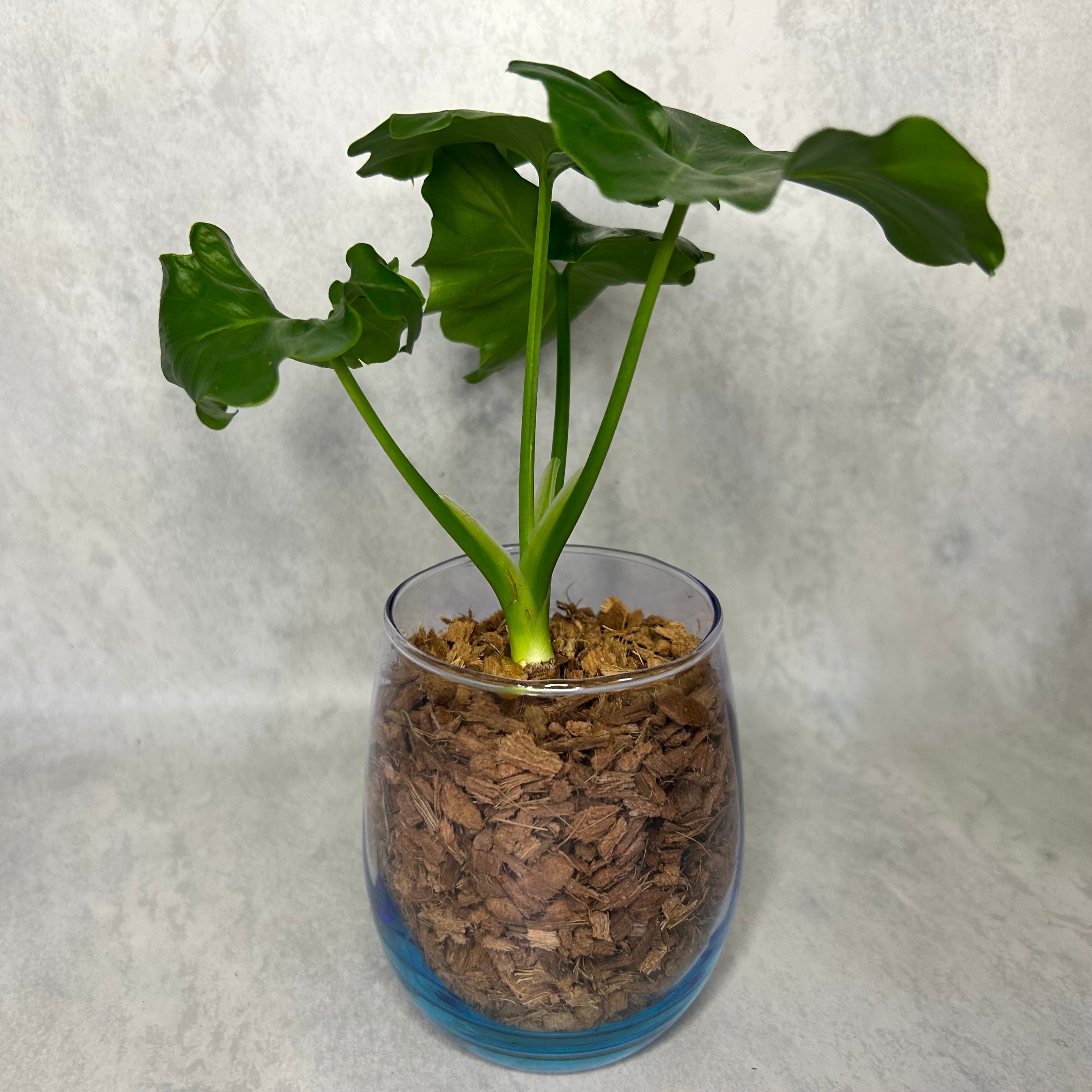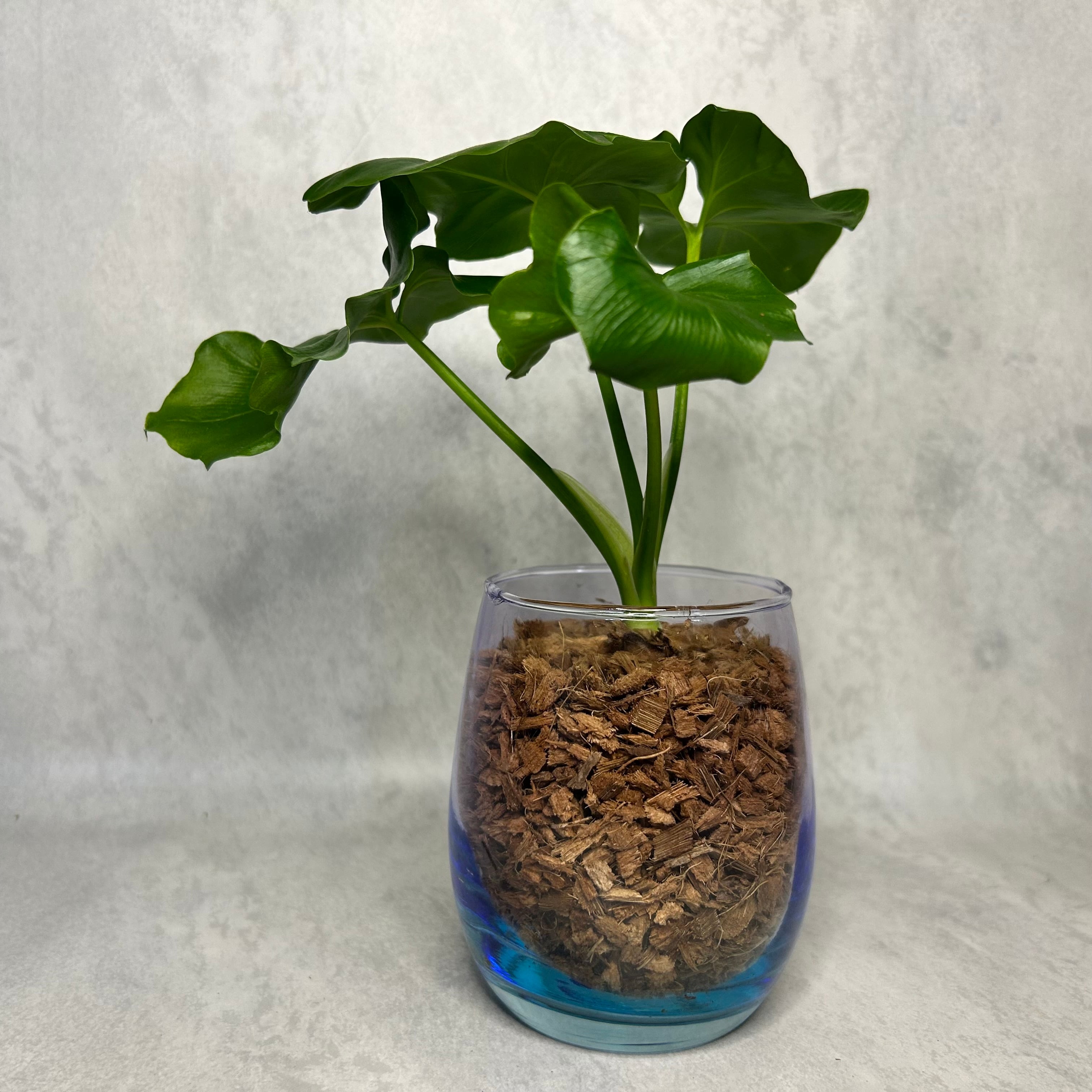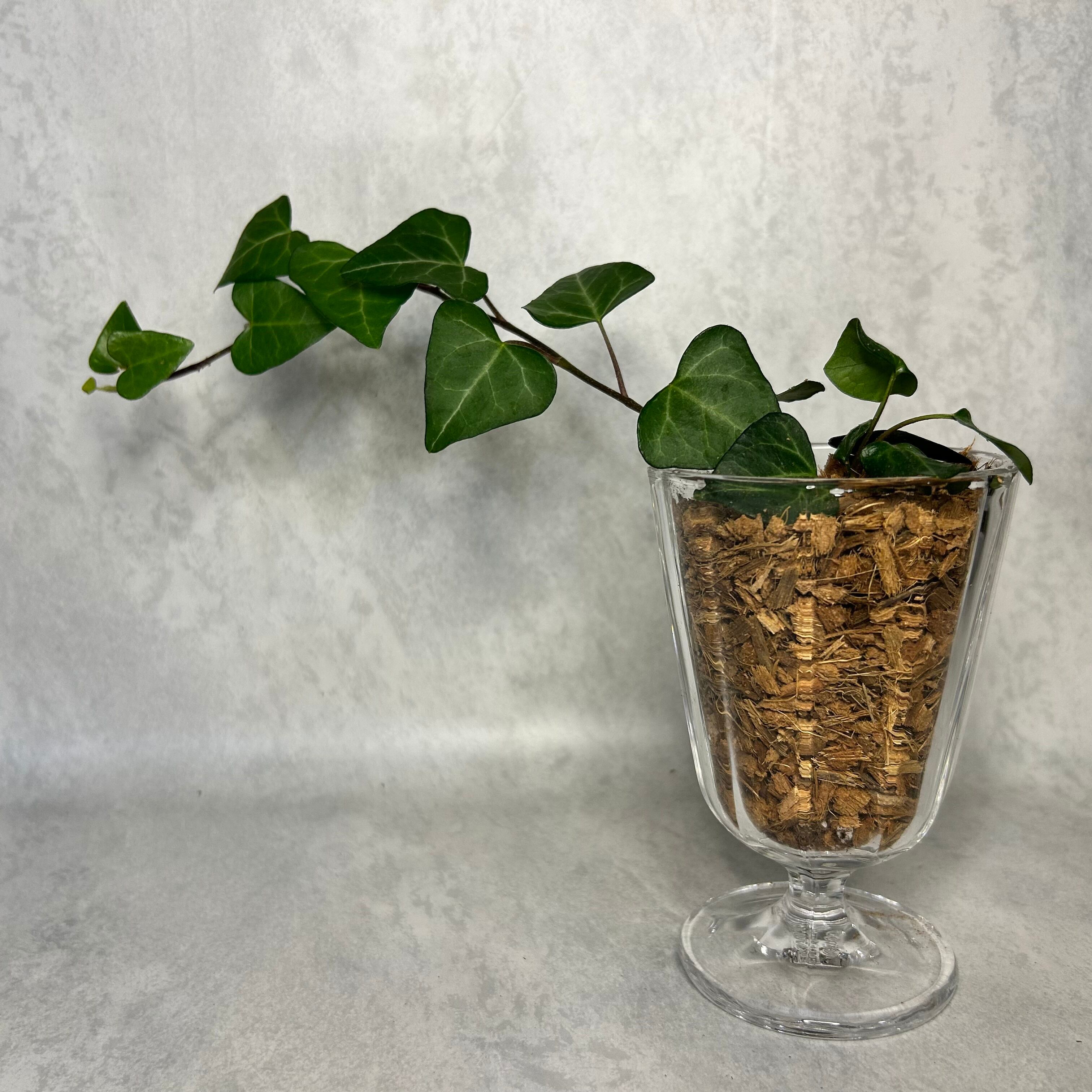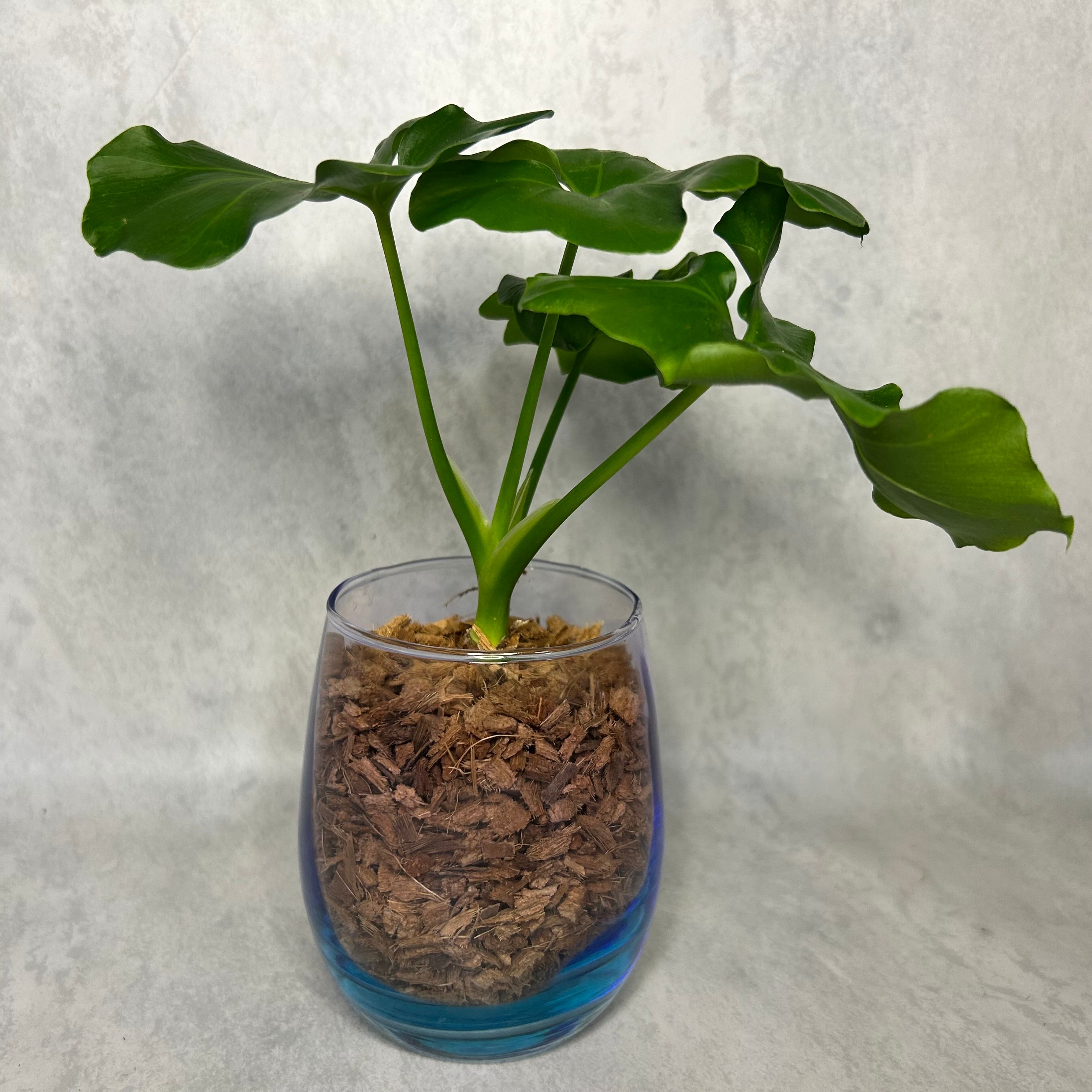 ガラス鉢に土の代わりにベラボン(ヤシの木チップ)で植えているので外から見て水やりのタイミングがわかりやすく管理が楽チン♫