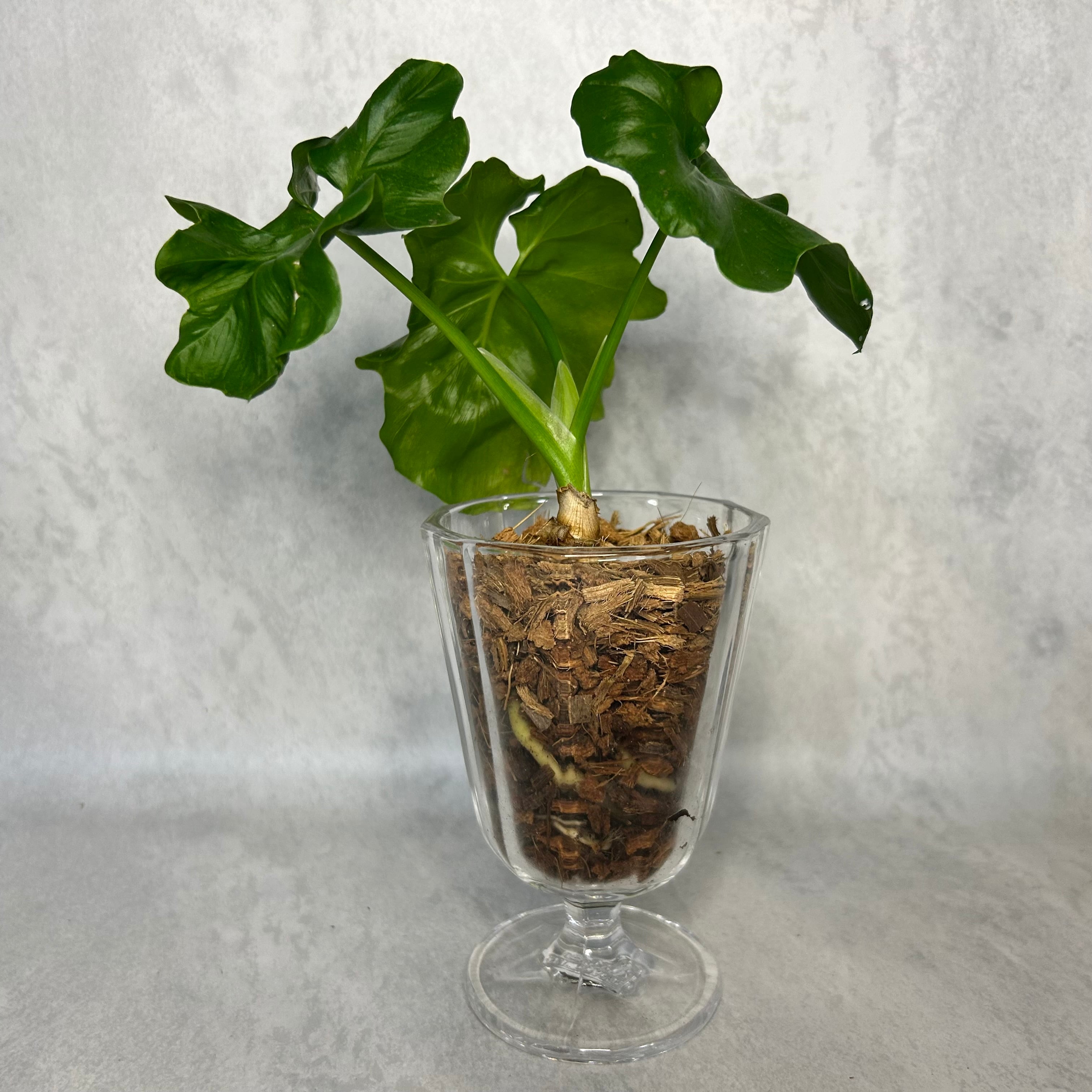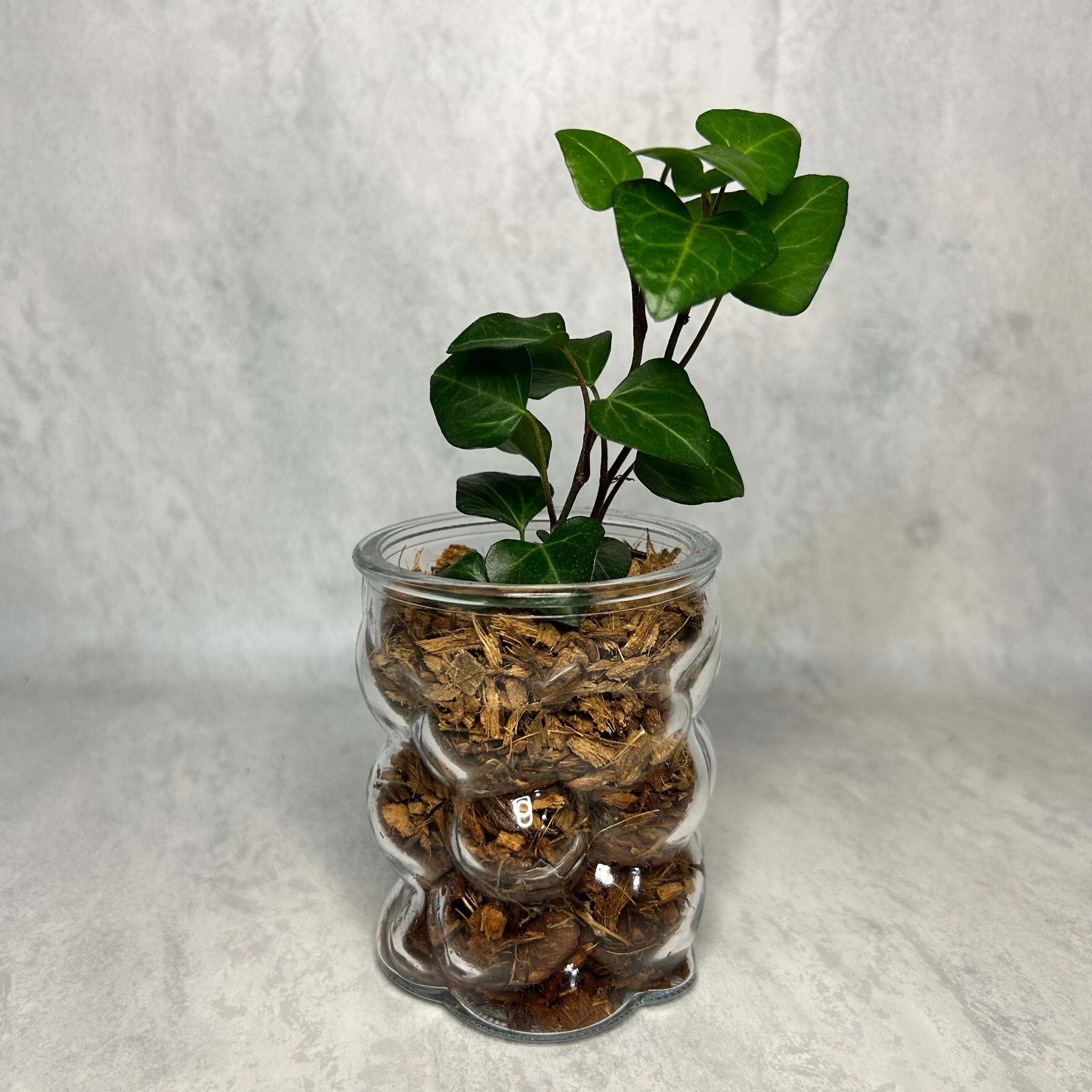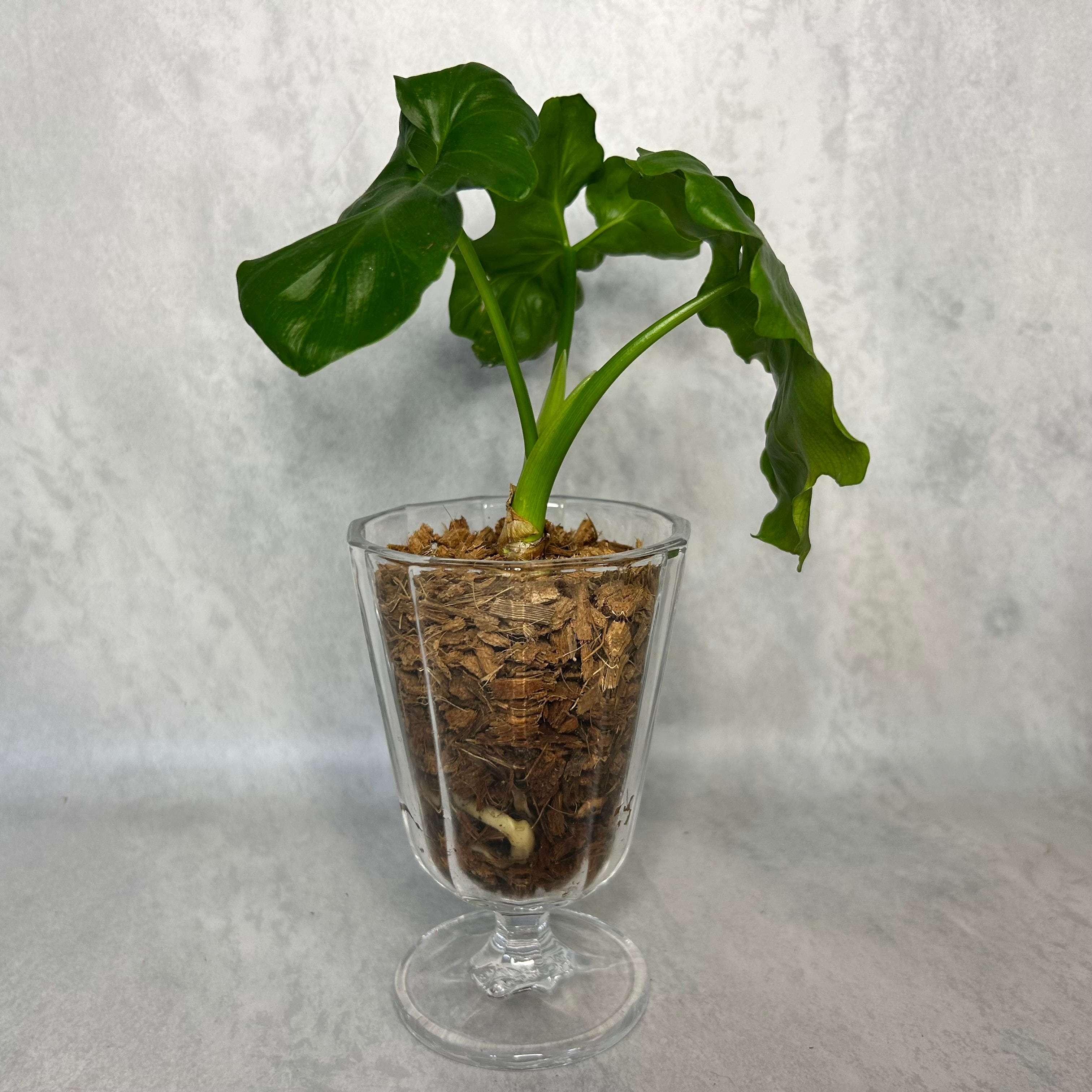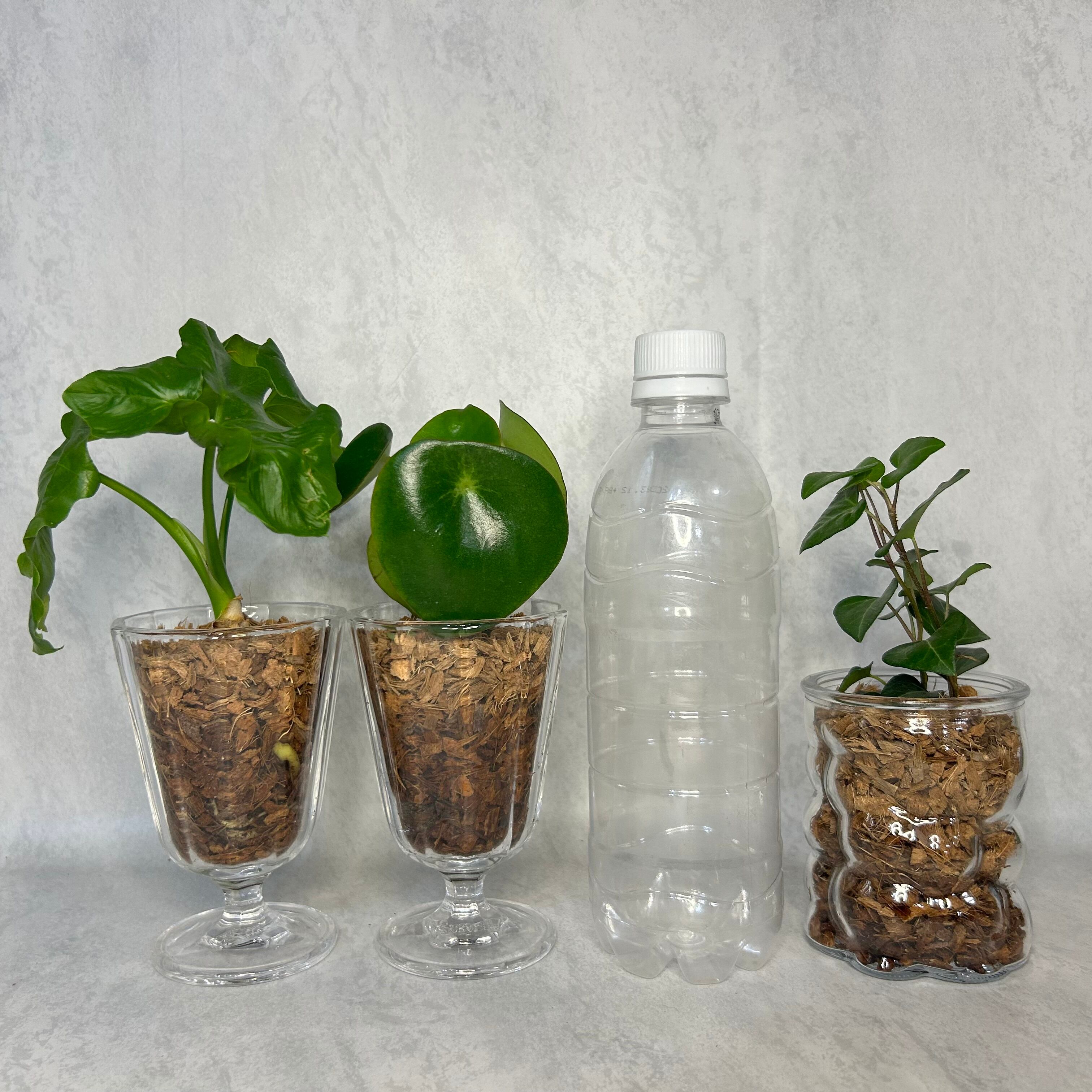 ガラス鉢に土の代わりにベラボン(ヤシの木チップ)で植えているので外から見て水やりのタイミングがわかりやすく管理が楽チン♫