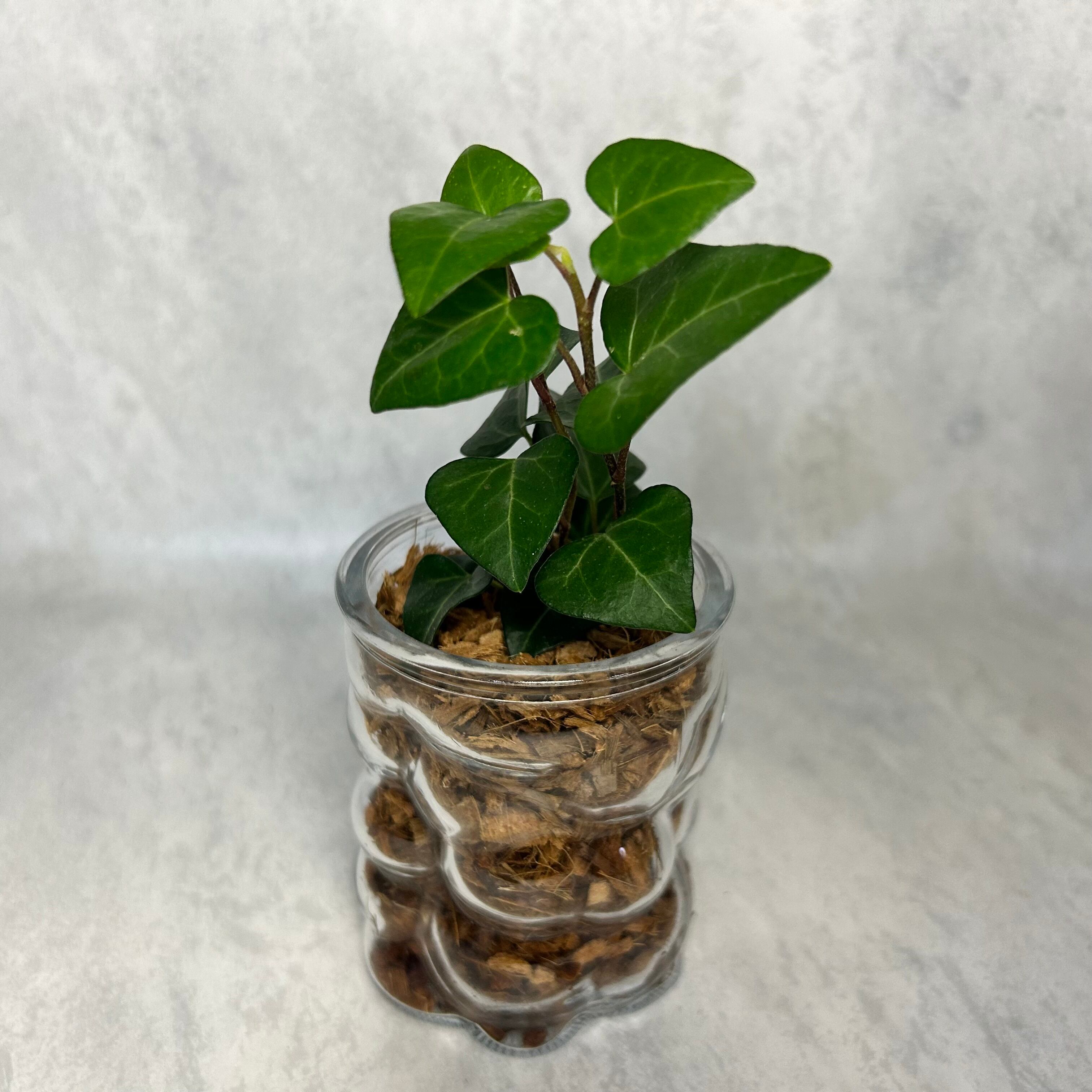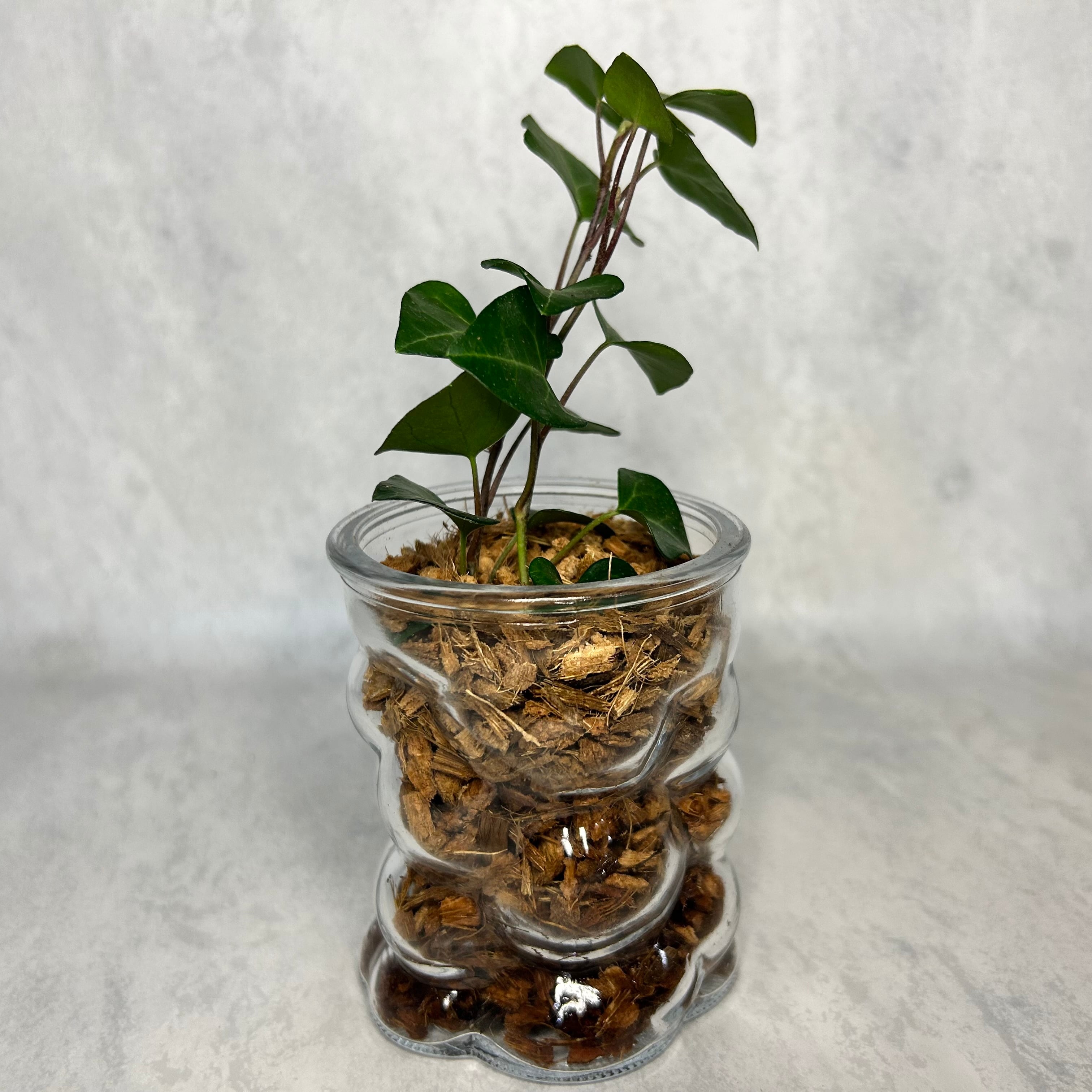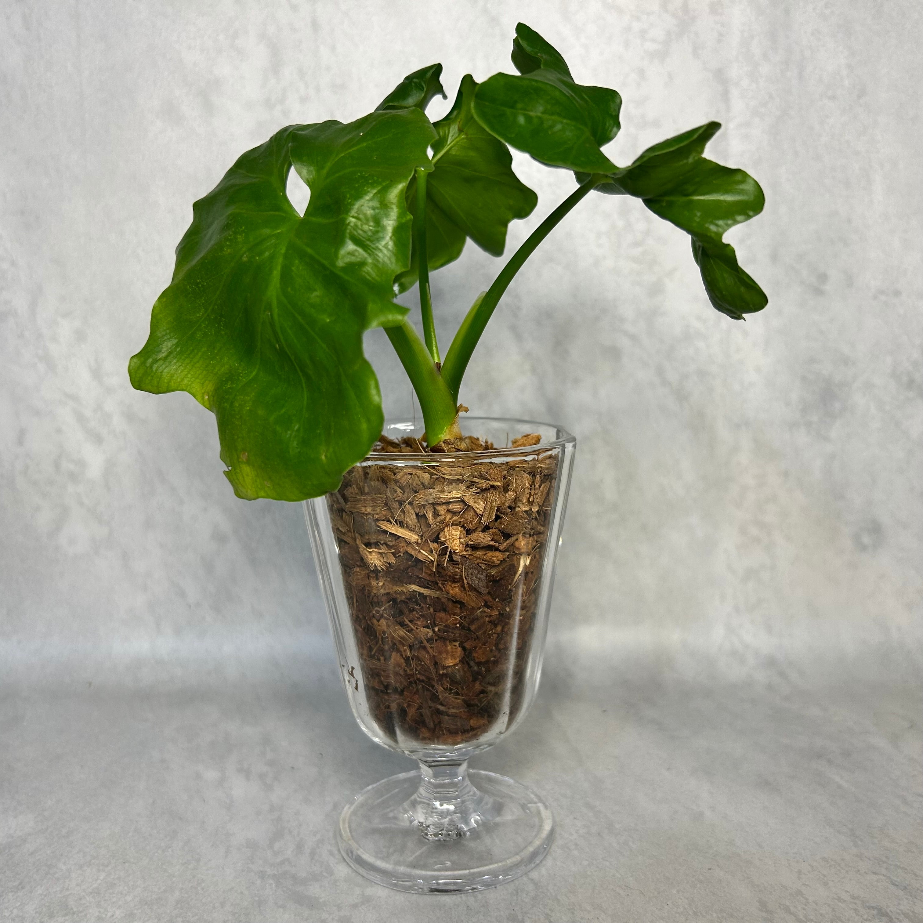 ガラス鉢に土の代わりにベラボン(ヤシの木チップ)で植えているので外から見て水やりのタイミングがわかりやすく管理が楽チン♫