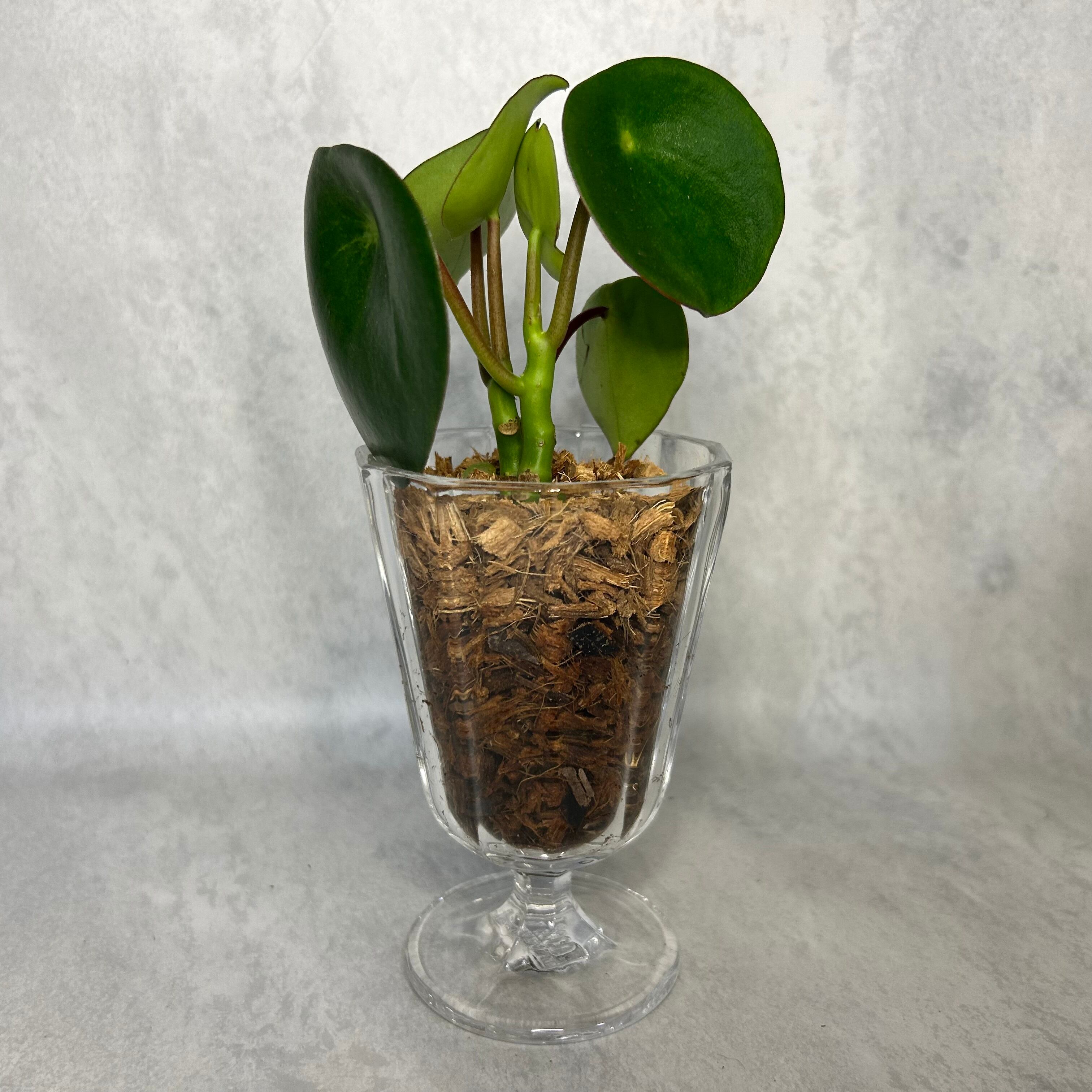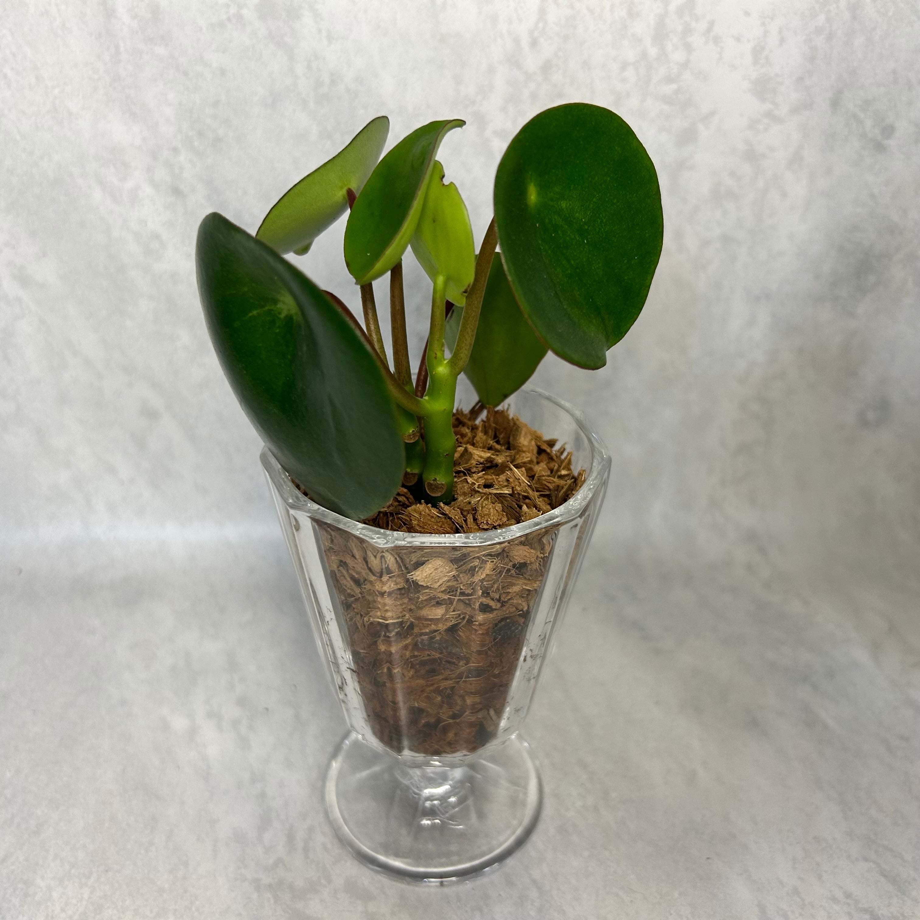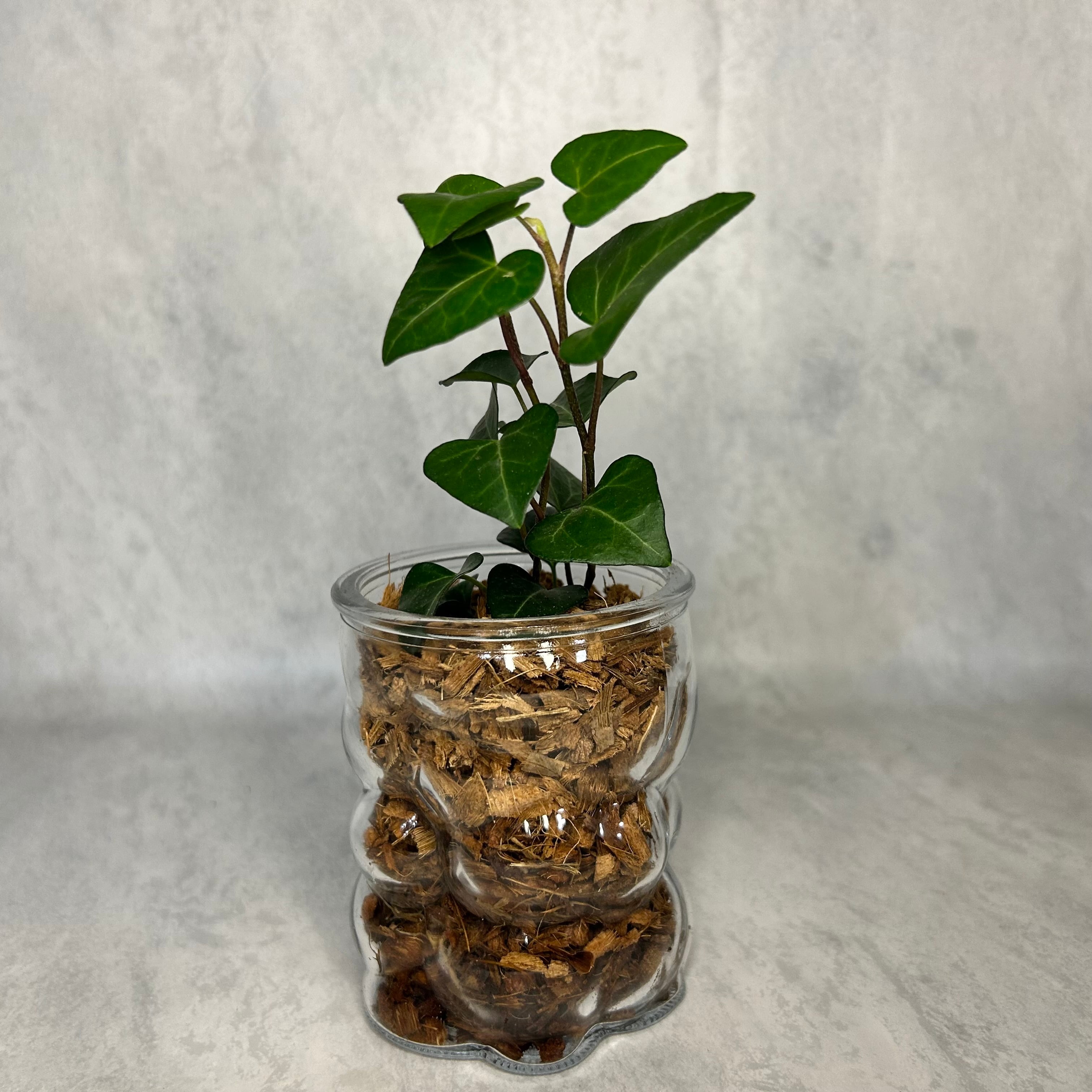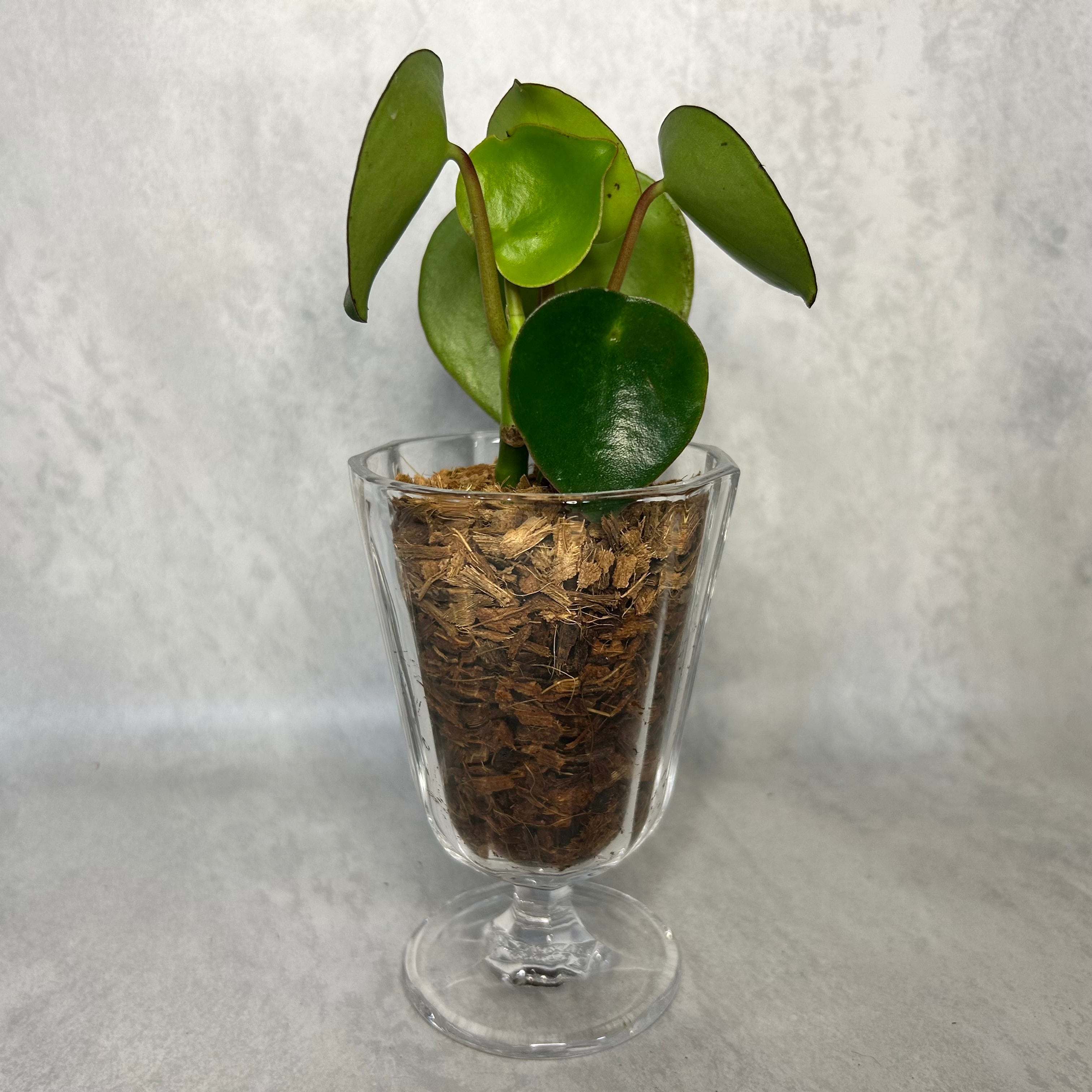 ガラス鉢に土の代わりにベラボン(ヤシの木チップ)で植えているので外から見て水やりのタイミングがわかりやすく管理が楽チン♫