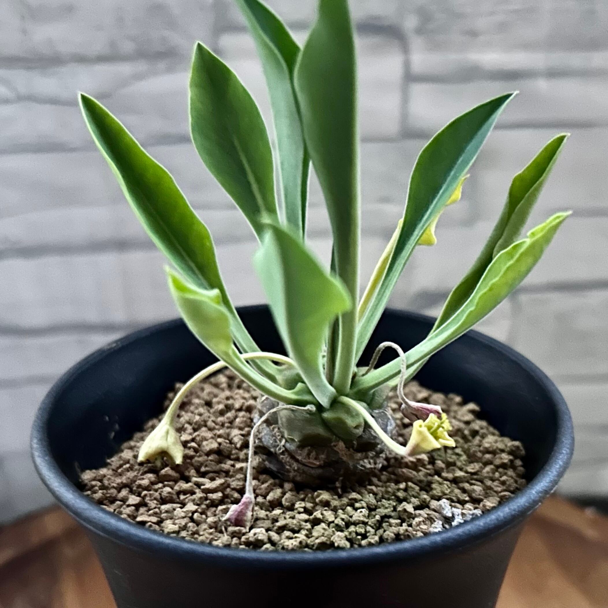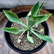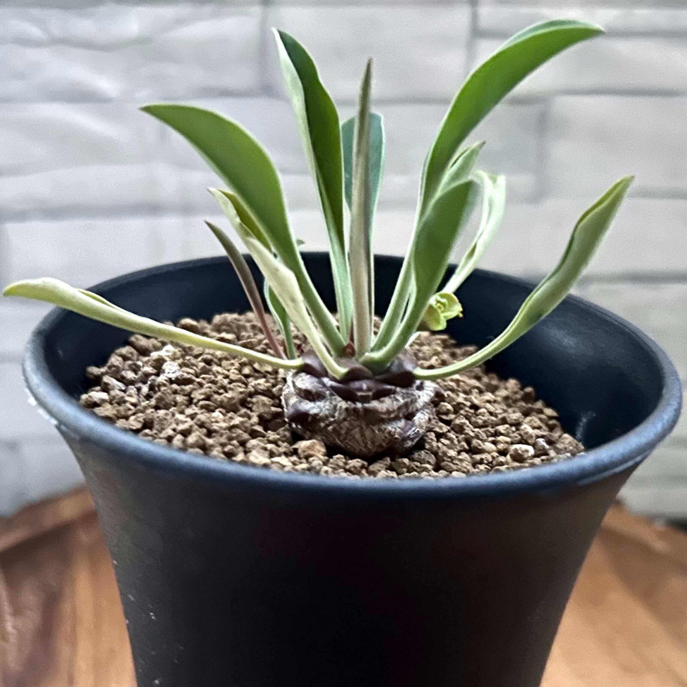 松ぼっくりのような胴体の頭頂部から葉を出す株姿は、小さなソテツを思わせます。