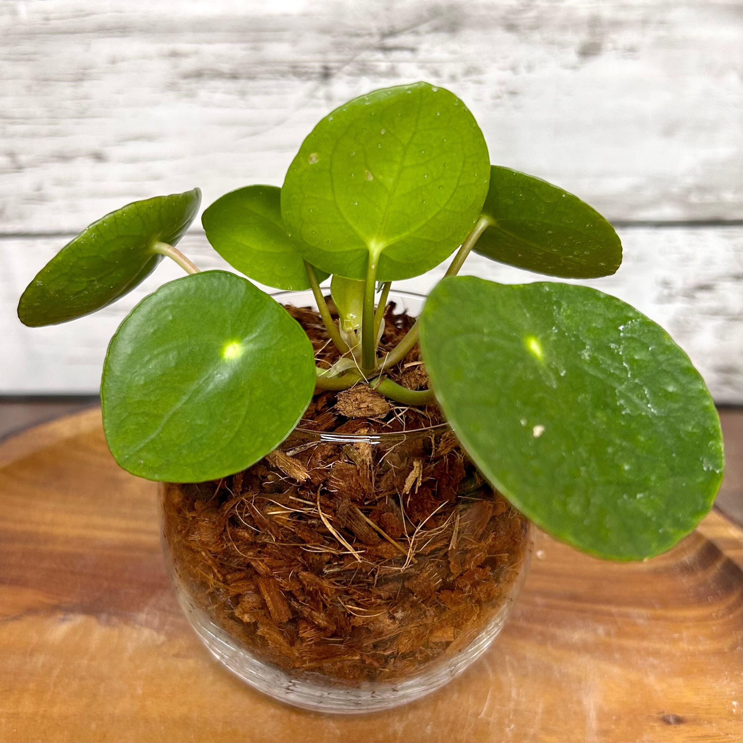 ペペロミオイデスとパキラのガラス鉢は透明です。