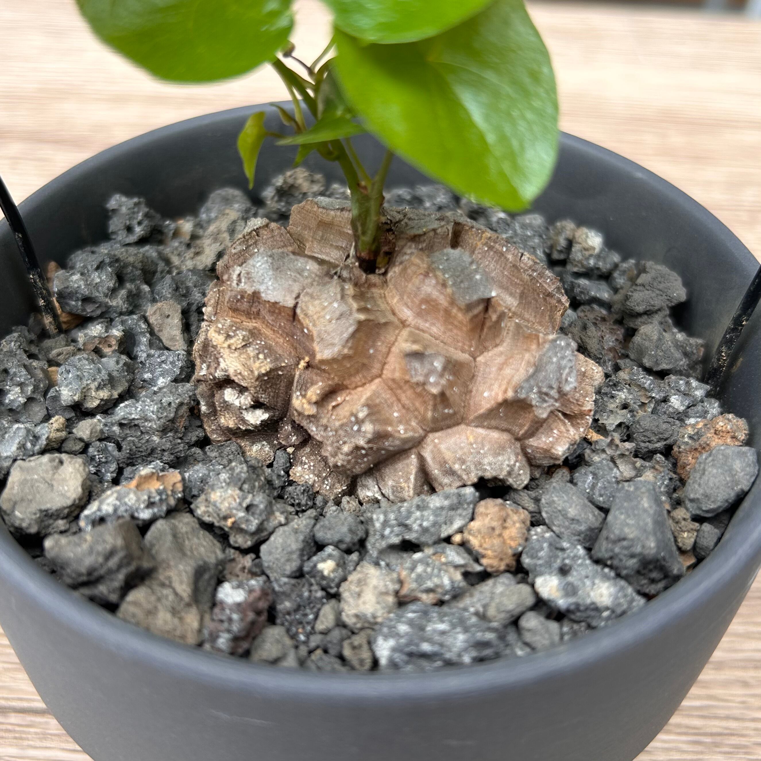 ただし、塊根部は直射日光に長時間当てると風化し表面が傷んでしまうので、葉にはしっかり日を当てる一方、塊根部は遮光気味にします。